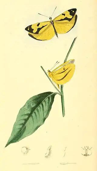- Male. Wings yellow, anterior above black, with an oblique yellow band and transverse basal line; posterior margin yellow. Fem. Wings above white; anterior, with the tips and marginal oblique stigma black. Posterior, above margined with black; beneath (in both sexes) yellow, with two transverse brown lines.
