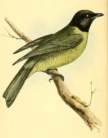 Its total length is nine inches and a quarter; the bill is nine lines from the gape to the tip, and four from the base of the nostrils, at which part the bill is not so proportionably broad as in the Swallow Berryeater (pl. 21.): the colour blueish-black, paler at the base: the whole head, sides, chin, and part of the throat are black, the feathers of the crown a little lengthened and pointed, giving a slight appearance of a crest: the wings and tail are dusky-black on the inner shafts and green on the outer; the whole of the upper plumage olive-green, and of the under pale greenish-yellow crossed with short dusky transverse lines from the breast downwards; under wing and tail-covers the same. Tail four inches from the base, slightly divaricated, and of twelve feathers. Wings four inches and a half, the first quill very short, the third, fourth and fifth of equal length. Legs black.