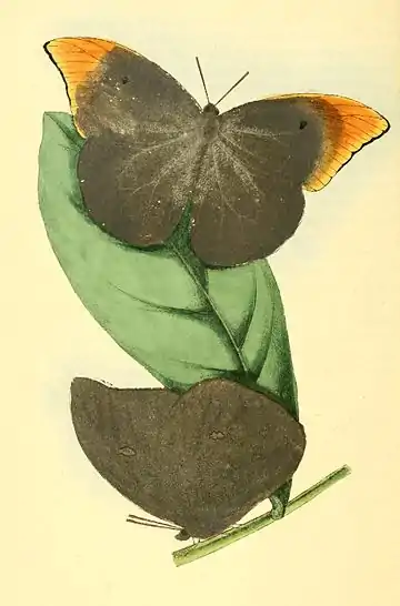 - (Male) wings slightly rounded, entire, greenish white; anterior pair above orange, at their tips, margin, and central dot black: each pair beneath with a central ferrugineous spot. Female ——?