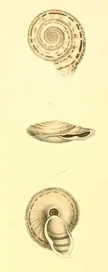 - Shell much depressed, marbled and doubly-banded with ferrugineous. Umbilicus large, deep. Aperture ear-shaped. Outer lip thickened, reflected, with a gibbous obsolete tooth within.