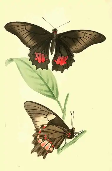 - Pap. (Tro. dent.) Wings dentated, black; posterior above with a five-cleft, violet-crimson spot; anterior beneath with a transverse, central, whitish band.