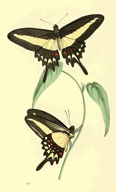 - Pap. (G. Caud.) wings black; with the common band and marginal lunules on the lower wings, yellow; lower wings with obtuse tails, and a row of red dots between the nerves.—Godart.