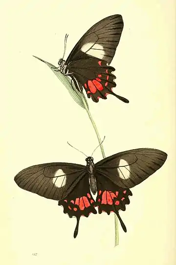 - P. (Tr. caud.) wings black; anterior with a central spot of white; posterior dentated and tailed, with a central red spot, divided by the nerves; stripe on each side the abdomen and spots on the thorax beneath, yellow.