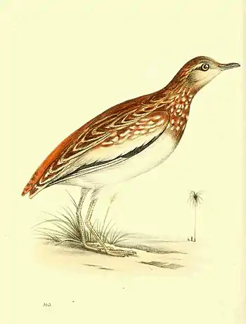 I have represented this delicate little bird of its natural size; which is so small, as scarcely to equal that of a Lark. The Turnix inhabits the sandy deserts of Africa and India, and seems to form a race of pigmy Bustards, all the species yet discovered (fourteen in number) being very diminutive. Little is known of their habits in a state of nature, further than that they migrate, and fly with great rapidity. The specific character will distinguish H. nivosus as a species; and I have already given a more detailed description of it in the Journal above quoted. Mr. Leadbeater received it from Senegal.