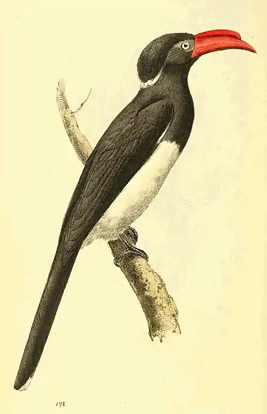 - Black Hornbill, with the abdomen, stripe on each side of the nape, and tip of the tail white. Bill slightly crested, (carinated,) and red.