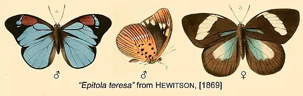 - Epitola teresa Hewitson, 1869: 86. Cameroon: “Cameroun”. Synonymy in Hewitson, [1869] Suppl.: 17, pl.1a, figs 3-5.