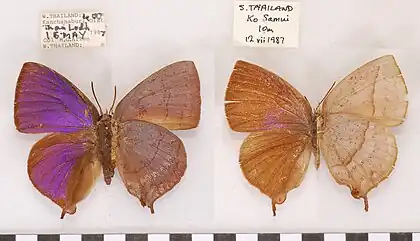 - Pinratana, A., 1981. Butterflies in Thailand, Vol. 4, Lycaenidae.Viratham Press, Bangkok. Reference page.