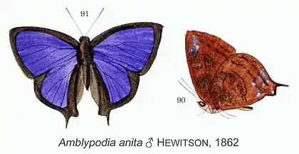 - Amblypodia anita Hewitson, 1862: 14, pl.8 figs 90-91; Butler, 1883: 147; Elwes, 1888: 403; de Nicéville, 1890: 211, pl.27 fig.191 ♀; Druce, 1895: 587; Pinratana, 1981: 111, pl. 19, fig.15; Eliot, 1992: 294, pl. 44, figs 12, 13, genit. 267.