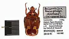 - Schoolmeesters, P. 2017. Scarabs: World Scarabaeidae Database (version Jul 2016). In: Roskov Y., Abucay L., Orrell T., Nicolson D., Bailly N., Kirk P., Bourgoin T., DeWalt R.E., Decock W., De Wever A., Nieukerken E. van, Zarucchi J., Penev L., eds. 2017. Species 2000 & ITIS Catalogue of Life, 30th January 2017. Digital resource at www.catalogueoflife.org/col. Species 2000: Naturalis, Leiden, the Netherlands. ISSN 2405-8858. Reference page. [accessed on April 27, 2017]