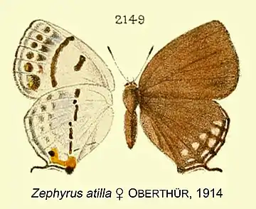 - Zephyrus atilla Oberthür, 1914: 52, pl.255 fig 2149.