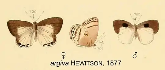 - Thecla argiva Hewitson, 1877: 208, pl.83 figs 700-702. Venezuela. Synonymy in Lamas, 2004: 123. images.