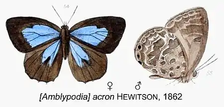 - Amblypodia acron Hewitson, 1862: 9, pl.5, figs 53,54.