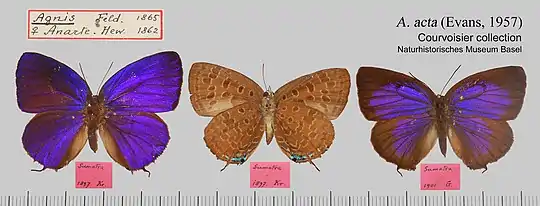 - Arhopala acta (Evans), Eliot, 1972: 2; Seki et al, 1991: 65, L228; Eliot, 1992: 285, 420, pl.42, figs 15,16, pl.68, fig. 12.