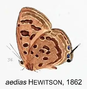 - Amblypodia aedias Hewitson, 1862: 6, pl.4, fig.36.
