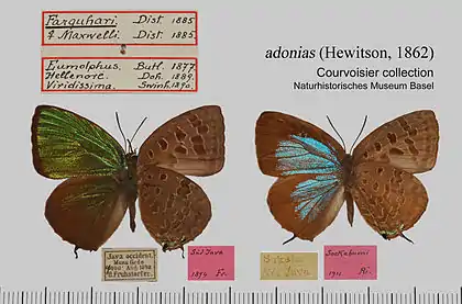 - Amblypodia adonias Hewitson, 1862: 8, pl.4 figs 32,33.