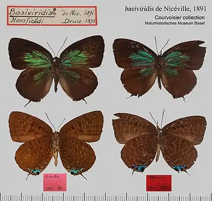 - Arhopala basiviridis de Nicéville, 1891: 373, pl.G fig.22.