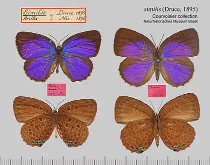 - Druce, H.H. 1895. A monograph of the Bornean Lycaenidae. Proceedings of the Zoological Society of London, 1895(3): 556-627, 4 pls. Reference page.
