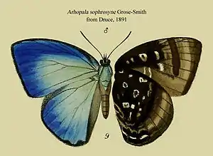 - Arhopala sophrosyne (Grose-Smith); Druce, 1891: 370, pl.32, fig.9; D'Abrera, 1977: 314; Parsons, 1998: 392, pl.59 1586-1589.