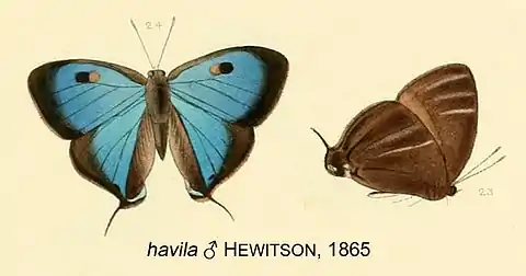 - Thecla havila Hewitson, [1865]: 76, pl.30, figs 23,24; Bridges, 1994: VIII.201.