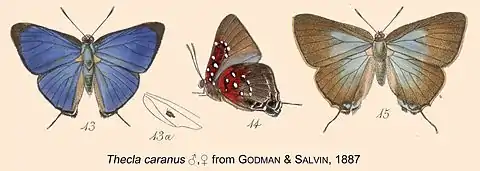 - Thecla caranus (Stoll); Godman & Salvin, 1887: 24, pl.50, figs 13-15.