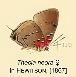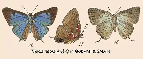 - Thecla neora Hewitson, [1867]: 90, pl.38 fig.110; Godman & Salvin, 1879: 24, pl.50 figs 16-18.