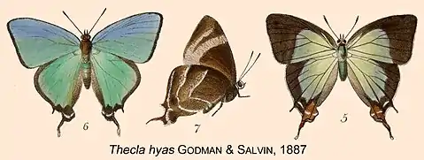 - Thecla hyas Godman & Salvin, 1887: 27, pl. 51, figs 5-7.
