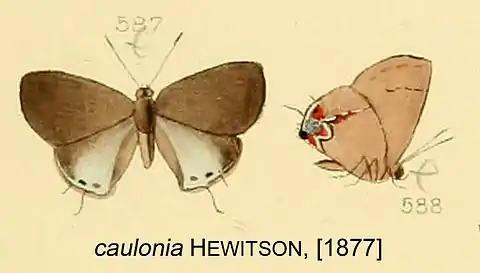 - Thecla caulonia Hewitson, [1877]: 188, pl.75 figs 587,588
