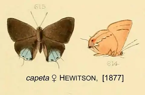 - Thecla capeta Hewitson, [1877]: 193, pl.77, figs 614,615. fem Nicaragua, BMNH, images.