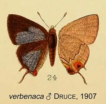- Thecla verbenaca H.H. Druce, 1907: 622, pl.36, fig.24; Bridges, 1994: VIII.484.
