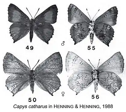 - Capys catharus catharus (Riley); Stempffer, 1967: 172; Henning & Henning, 1988: 120, figs 49,50,55,56,82,83,98,99; Williams, 2007: Deudoricina 63.