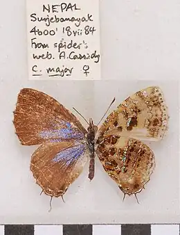 - Catapaecilma major Druce; D'Abrera, 1986: 588; Seki et al, 1991: 73, L266; Eliot, 1992: 295, 421, pl.45 figs 5-7, genit. 272.