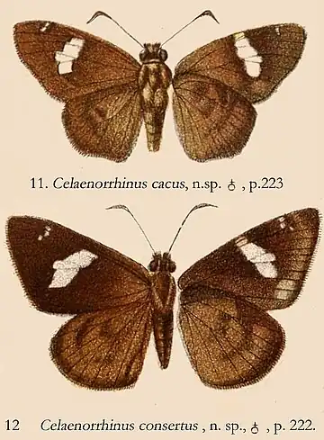 - Celaenorrhinus cacus de Nicéville, 1890: 222, Pl.E Fig.11 Dry Season Form.