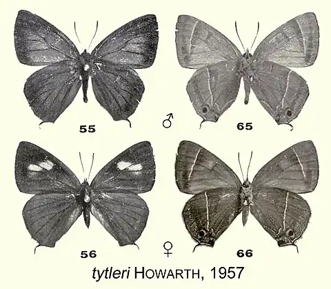 - Neozephyrus tytleri Howarth, 1957: 249, fig.12 ♂ genit., figs 55,56,65,66.
