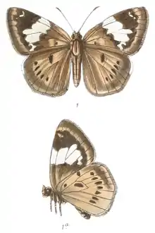 - de Nicéville, L., 1889. On new and little-known butterflies from the Indian Region with a revision of the genus Plesioneura of Felder and of Authors. J. Bombay nat. Hist. Soc. 4(3): 163-194, pls A,B. Reference page.