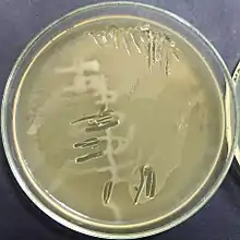 Cosenzaea myxofaciens colonies on a standard growth medium, showing the characteristic "swarming" patterns.