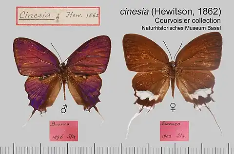 - Myrina cinesia ♀ Hewitson, 1863: 29, pl. 13, figs 18-20.