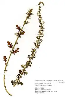 - Lectotype (designated by Uotila 2013, Willdenowia, 43(1): 76.): "Chenopodium foetidum Cav. (teste Bunge). Spec. culta. Herb. Schrader" [label written by a curator; plant of unknown origin, cultivated by Schrader]. Lectotype: LE.
