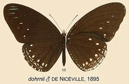 - Elymnias (Melynias) dohrnii de Nicéville, 1895: 21, pl.S fig.12.