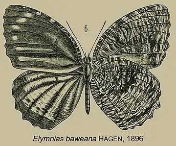 - Elymnias baweana Hagen, 1896: 184, pl.4, fig.6.
