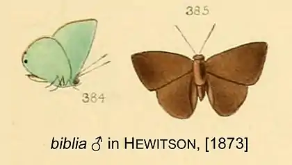 - Thecla biblia Hewitson, 1868: 12; [1873]: 150, pl.59, figs 384,385; Bridges, 1994: VIII.69.