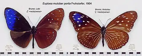 - Euploea mulciber portia Fruhstorfer, 1904: 177; D'Abrera, 1982: 219.