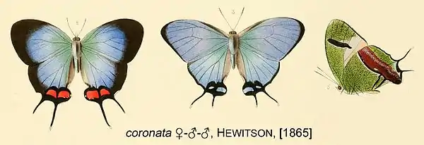 - Thecla coronata Hewitson, 1865: 70, pl.27, figs 3-5; Bridges, 1994: VIII.120.