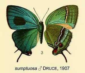 - Thecla sumptuosa Druce, 1907: 571, pl.31, fig.3 ♂; Bridges, 1994: VIII.447.