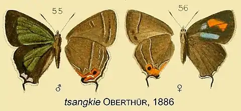 - Thecla tsangkie Oberthür, 1886: 20, pl.7, figs 55, 56.
