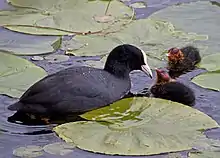 Fulica atra atra, adult with chicks; West Bromwich, England