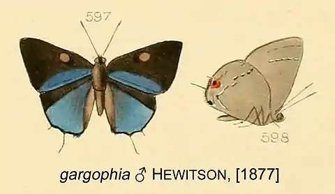 - Thecla gargophia Hewitson, [1877]: 78, pl.75, figs 597,598.