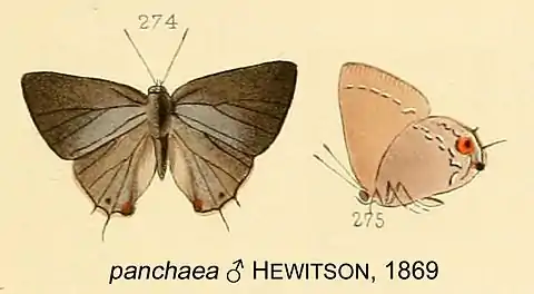 - Thecla panchaea Hewitson, 1869: 126, pl.51, figs 274,275;