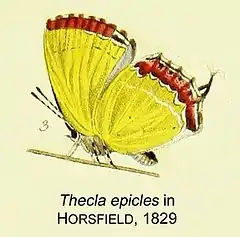 • Thecla epicles (Godart); Horsfield, [1829]: 92, pl.1 fig.3; Westwood, [1851]: 487.