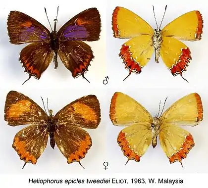 - Heliophorus epicles tweediei Eliot, 1963: 173, figs 2a-d; Bridges, 1994: IX.49.
