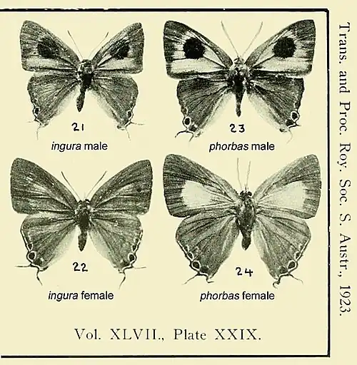 - Hypolycaena phorbas ingura Tindale, 1923: 349, Pl.29 figs. 21,22; McCubbin, 1971: 106; D'Abrera, 1971: 305; Bridges, 1994: IX.63.